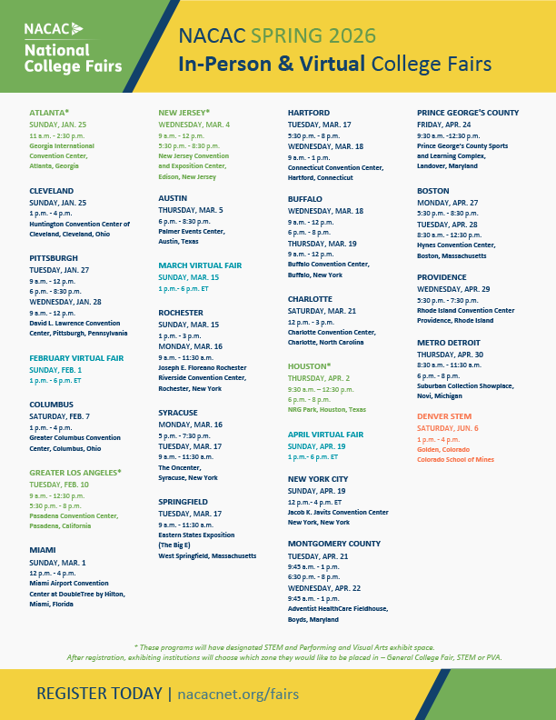Enter your information below to start receiving the latest NACAC National College Fairs announcements including dates, cities, registration, and more!