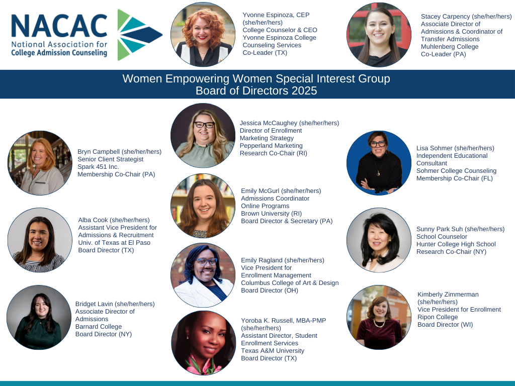 The Women Empowering Women SIG’s mission is to empower and support female-identifying professionals involved in the college counseling and admission process (high school counselors, admissions professionals, IECs, CBOs, vendors and retired professionals) through connection, professional development, and research.